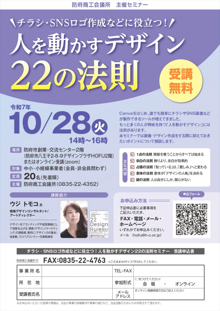> お知らせ > 10月28日(火) 人を動かすデザイン22の法則 セミナーを開催します 10月28日(火) 人を動かすデザイン22の法則 セミナーを開催します 参加ご希望の方は下記フォームからお申し込み下さい。受講のお申込はこちらから【申込フォーム】 ≪NEXT │お知らせ一覧│ BACK≫