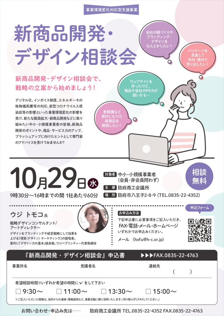 > お知らせ > 10月29日(水) 新商品開発・デザイン相談会を開催します 10月29日(水) 新商品開発・デザイン相談会を開催します 参加ご希望の方は下記フォームからお申し込み下さい。□2025年10月29日(水) 新商品開発・デザイン相談会 申込フォーム ≪NEXT │お知らせ一覧│ BACK≫