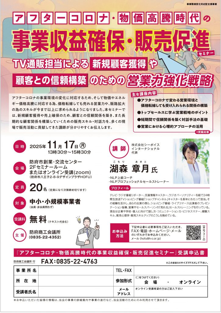 > お知らせ > 11月17日(月) アフターコロナ・物価高騰時代の事業収益確保・販売促進セミナーを開催します 11月17日(月) アフターコロナ・物価高騰時代の事業収益確保・販売促進セミナーを開催します 参加ご希望の方は下記フォームからお申し込み下さい。□2025年11月17日(月) アフターコロナ・物価高騰時代の事業収益確保・販売促進セミナー 申込フォーム │お知らせ一覧│ BACK≫