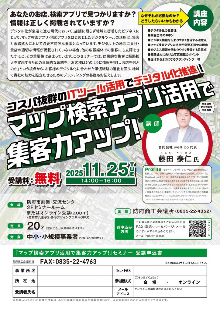 > お知らせ > 11月25日(火) マップ検索アプリ活用で集客力アップセミナーを開催します 11月25日(火) マップ検索アプリ活用で集客力アップセミナーを開催します 参加ご希望の方は下記フォームからお申し込み下さい。□2025年11月25日(火) マップ検索アプリ活用で集客力アップセミナー 受講申し込みフォーム │お知らせ一覧│ BACK≫