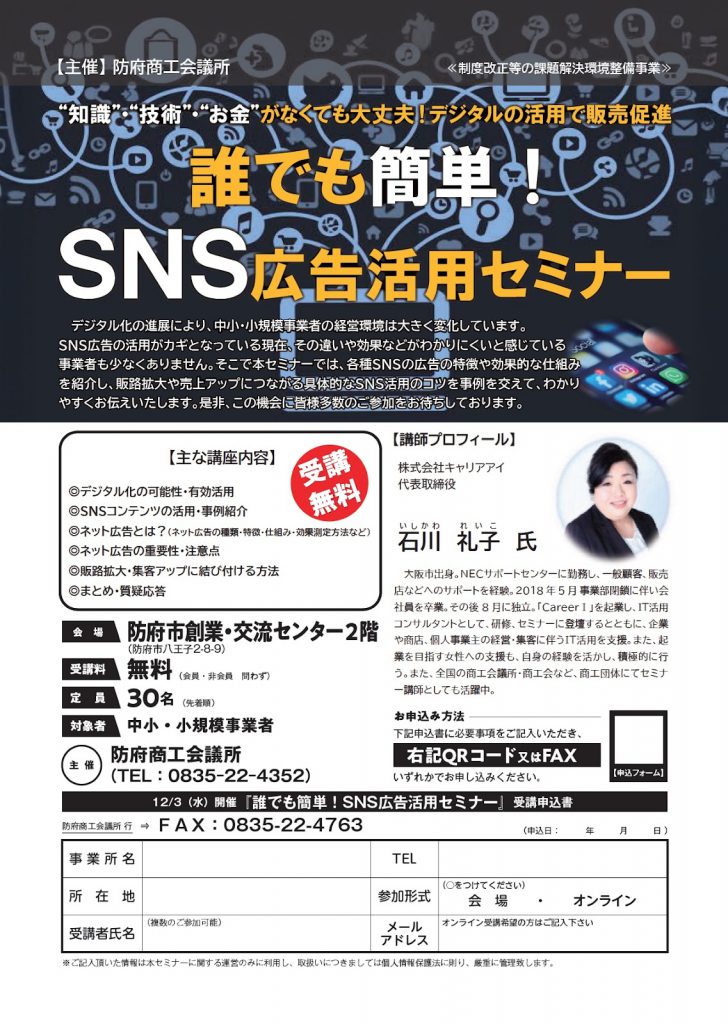 > お知らせ > 12月3日(水) 誰でも簡単!SNS広告活用セミナーを開催します 12月3日(水) 誰でも簡単!SNS広告活用セミナーを開催します 参加ご希望の方は下記フォームからお申し込み下さい。□2025年12月3日(水) 誰でも簡単!SNS広告活用セミナー 申込フォーム ≪NEXT │お知らせ一覧│ BACK≫