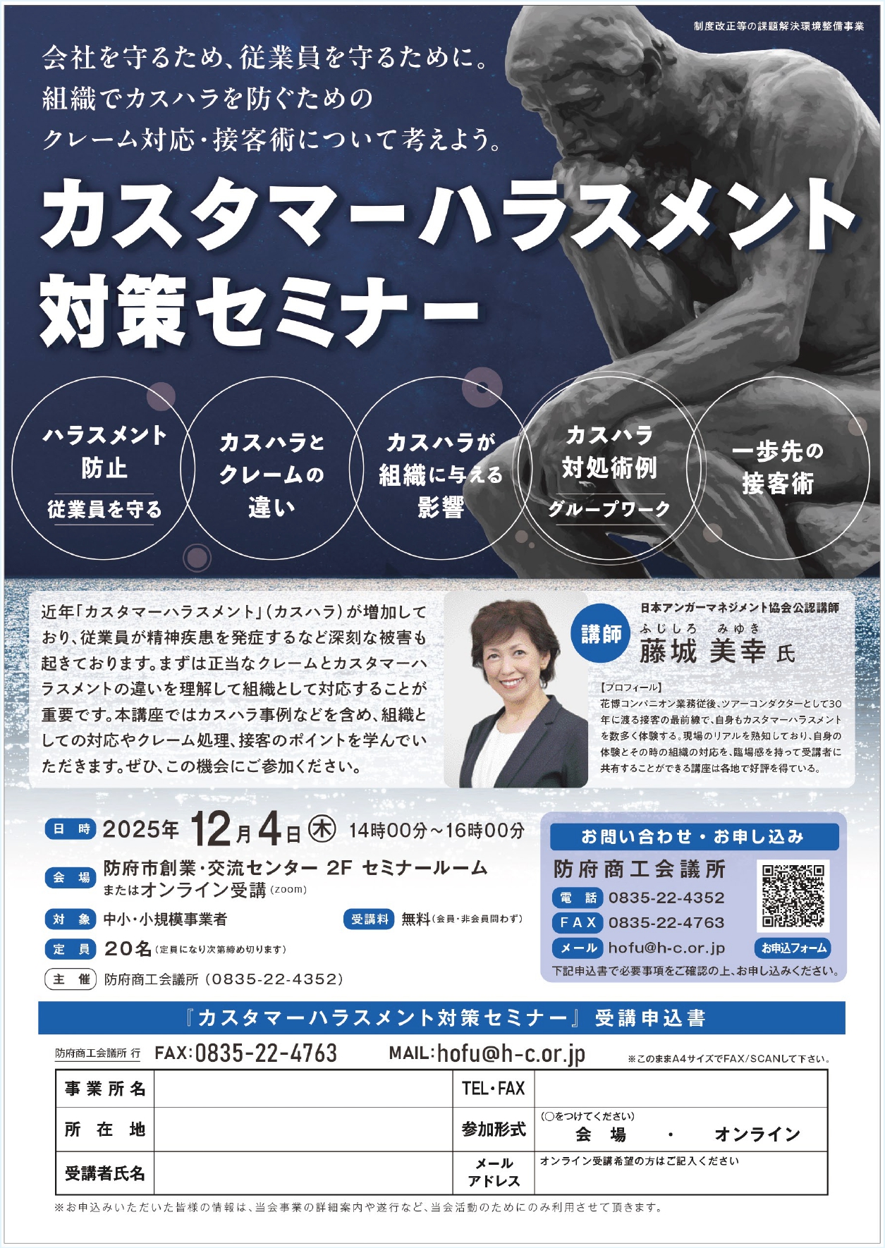 > お知らせ > 12月4日(木) カスタマーハラスメント対策セミナーを開催します 12月4日(木) カスタマーハラスメント対策セミナーを開催します 参加ご希望の方は下記フォームからお申し込み下さい。□2025年12月4日(木) カスタマーハラスメント対策セミナー 申込フォーム ≪NEXT │お知らせ一覧│ BACK≫