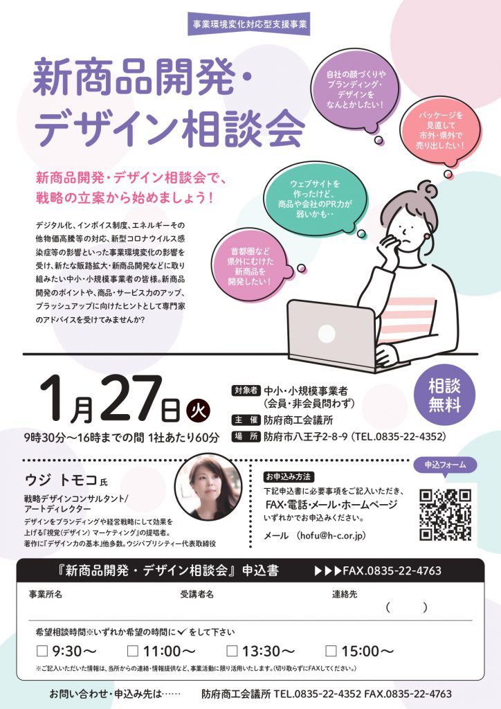 > お知らせ > 1月27日(火) 新商品開発・デザイン相談会を開催します 1月27日(火) 新商品開発・デザイン相談会を開催します 参加ご希望の方は下記フォームからお申し込み下さい。□2026年1月27日(火) 新商品開発・デザイン個別相談会 申込フォーム ≪NEXT │お知らせ一覧│ BACK≫
