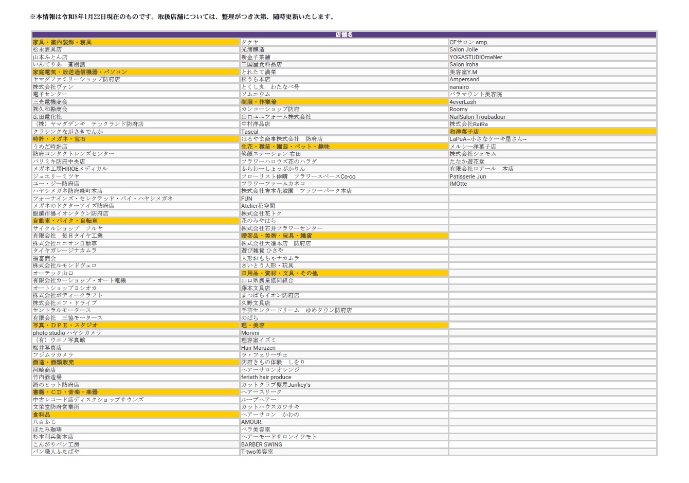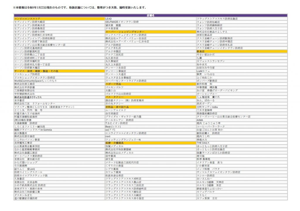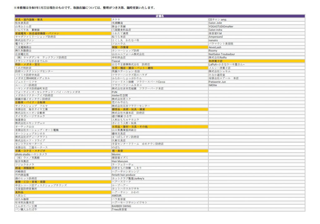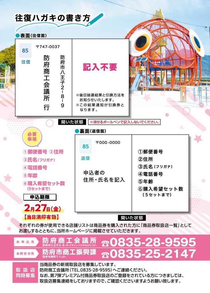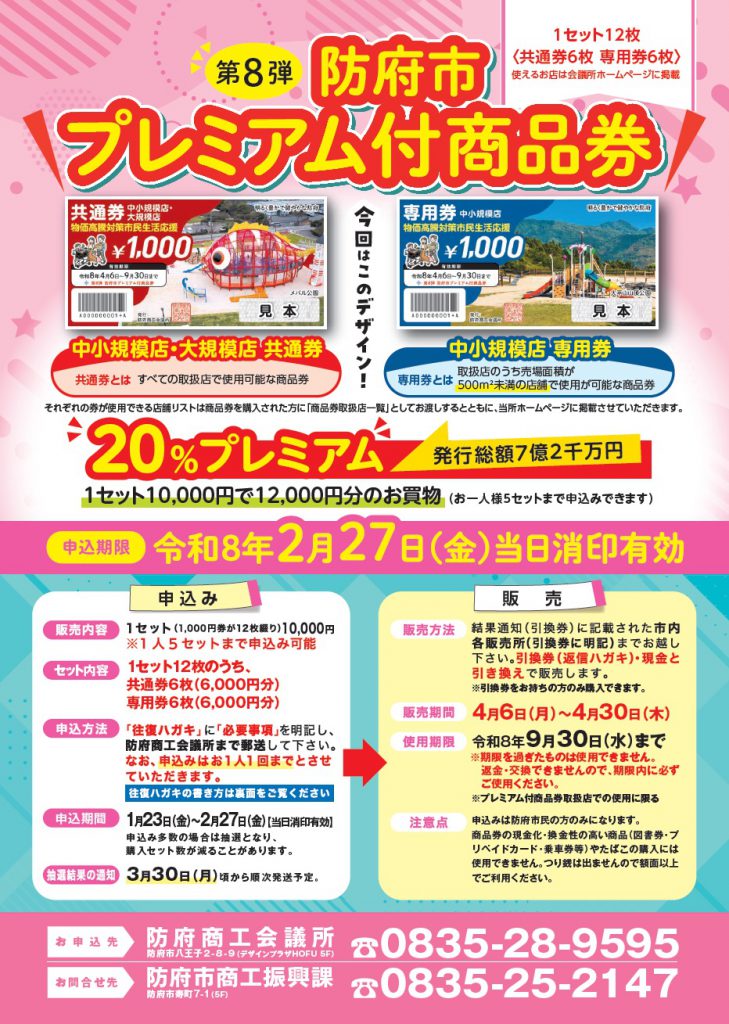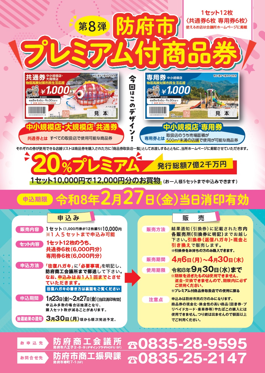 > お知らせ > 第8弾 防府市プレミアム付商品券 申込方法・取扱店舗一覧 第8弾 防府市プレミアム付商品券 申込方法・取扱店舗一覧 物価高の影響を受ける市民生活を幅広く応援するため、「第8弾 防府市プレミアム付商品券」を発行します。 ↓往復はがきの書き方はこちら↓ ↓取扱店舗一覧はこちら↓ │お知らせ一覧│ BACK≫